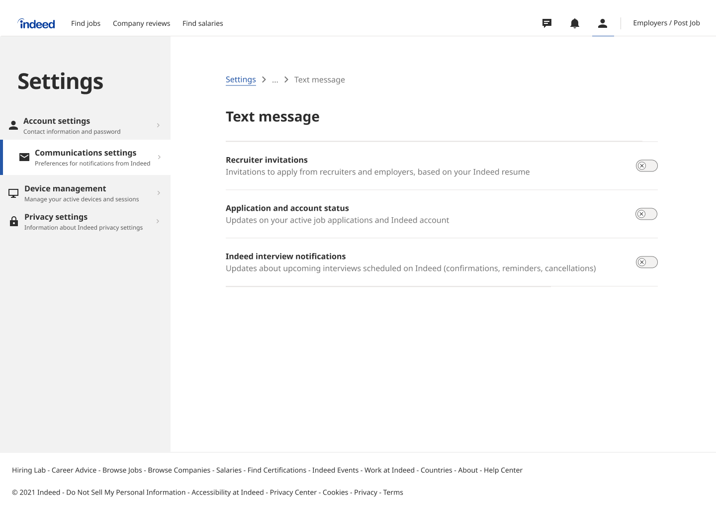 After understanding the context of the user journey, my goal was to incorporate the option to enable text message categories seamlessly into the user experience. The idea was to add the text message categories options to the live page. Initially, I created a radio button design that allowed the user to opt-in to several options simultaneously. However, it did not cover the consent requirements stated by the Legal team. During the iteration, the stakeholders descoped the text categories, and the attention turned to ensuring the screen met consent requirements as they needed to be in their current state. The focus switches from radio buttons to a pop-up modal to request the transfer of consent for each category previously enabled for the updating phone number flow. I found this to be the best design that minimizes disruption from the primary goal of adding/updating the phone number while acquiring the needed consent per Legal. Following the Indeed Design Library and Design System guidelines, I could design for desktop and mobile screens. The final designs include the elements of the design system as auto layouts to simplify editing designs which I learned is the best way to create screens.