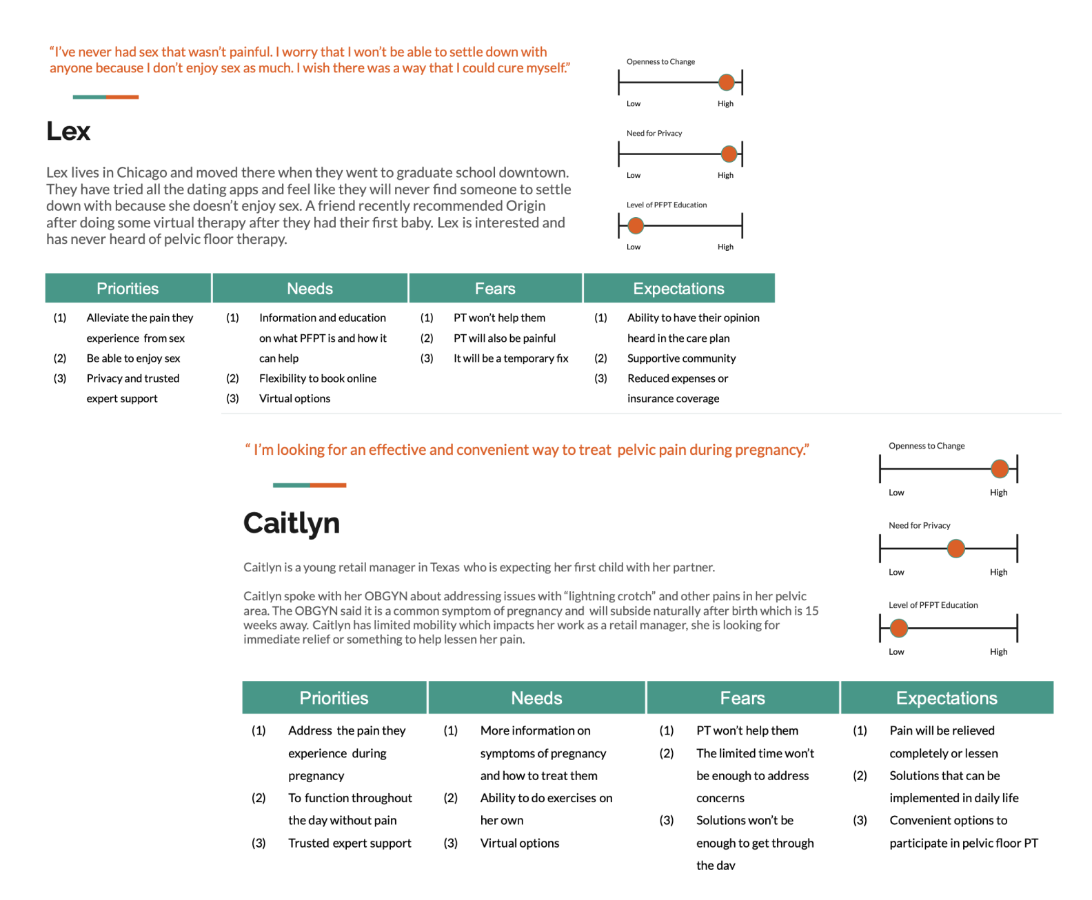 I provided priorities, needs, fears, and expectations for each persona, including; how open they were to change, their need for privacy, and the level of pelvic floor physical therapy.